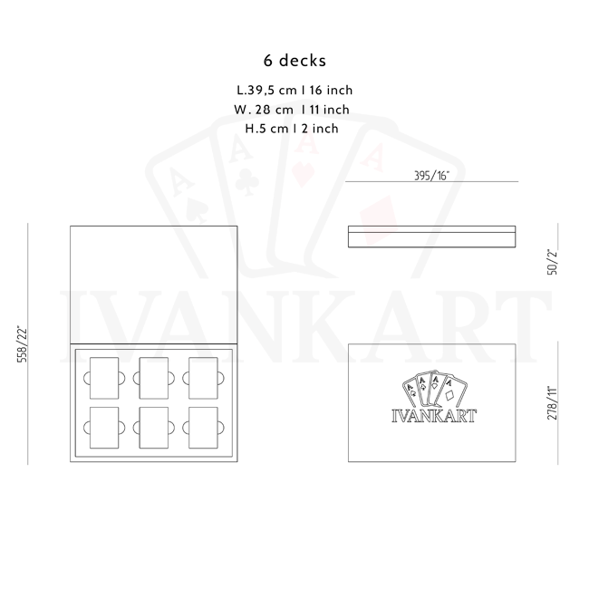 - Capacity: 6 standard poker-size decks (64 × 89 × 18 mm) (e.g., Bicycle, Theory11, Ellusionist, Cartamundi)