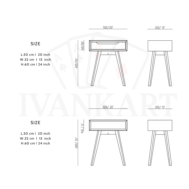 A compact, elegant nightstand designed for smaller bedrooms, guest rooms, and modern apartments. The splayed legs add stability and a light silhouette, while the clean top keeps essentials within reach. Available with a smooth front drawer for concealed storage or without a drawer for a minimalist look. Handcrafted in small batches and easy to pair with Scandinavian, modern, or mid-century interiors.