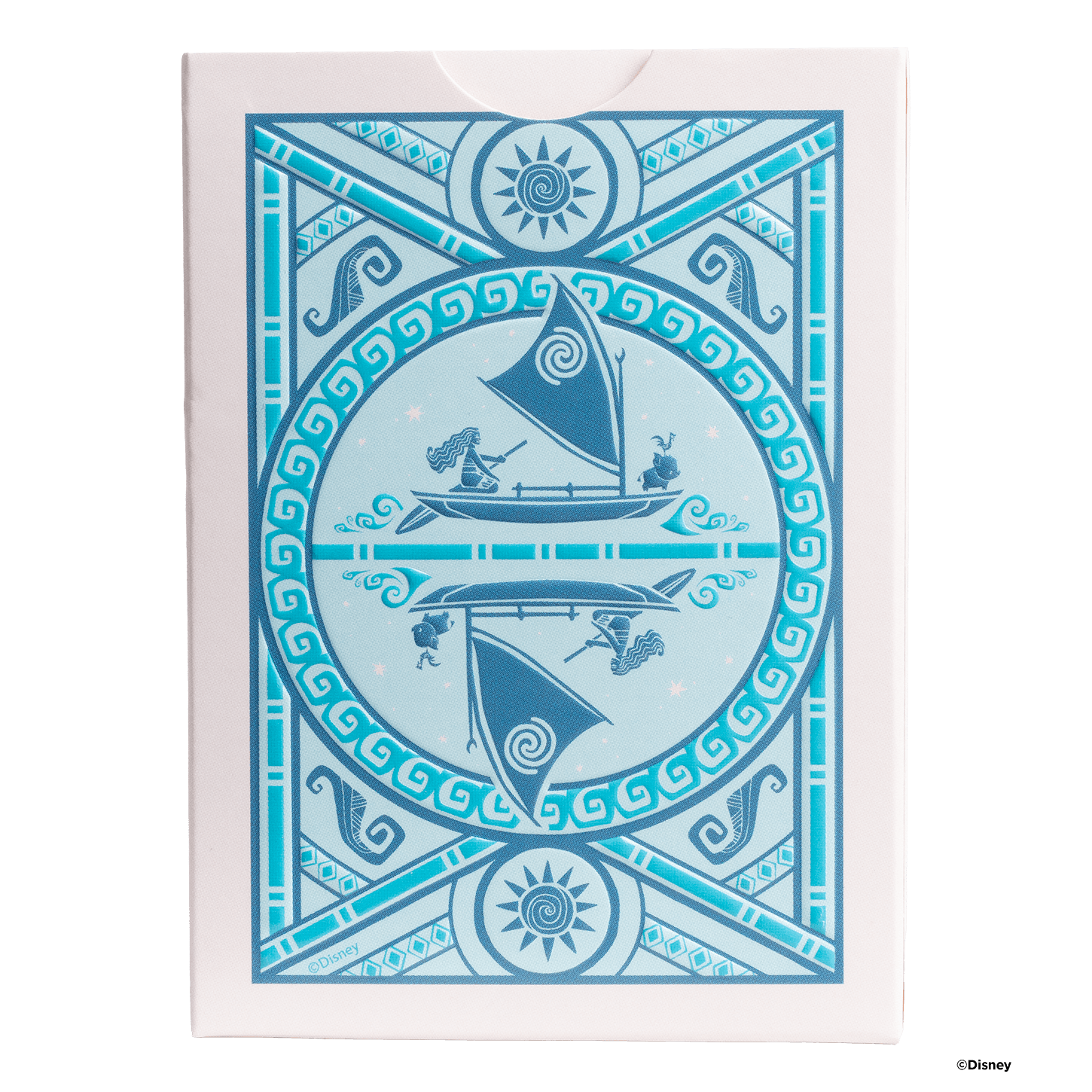 The tuck box is adorned with colorful island motifs and official Moana artwork, while the card backs and faces feature custom illustrations, tropical pips, and detailed court cards depicting characters and themes from the film. Every hand feels like a journey across the sea.