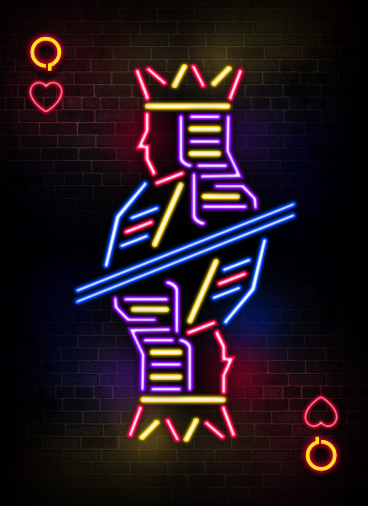 The tuck box glows with classic Vegas-style fonts, retro signage, and vibrant neon accents. Inside, you’ll find custom court cards and pips, all echoing the glitz of roulette wheels, card tables, and vintage Vegas charm.