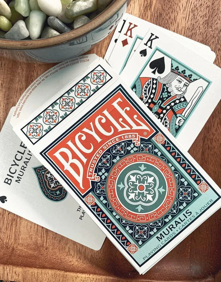 Unveil the artistry of tradition with the Bicycle Muralis Playing Cards — a deck that blends fine design with timeless Bicycle craftsmanship. Inspired by the grace of mural art, this edition brings symmetry, geometry, and ornamental beauty into your hands.