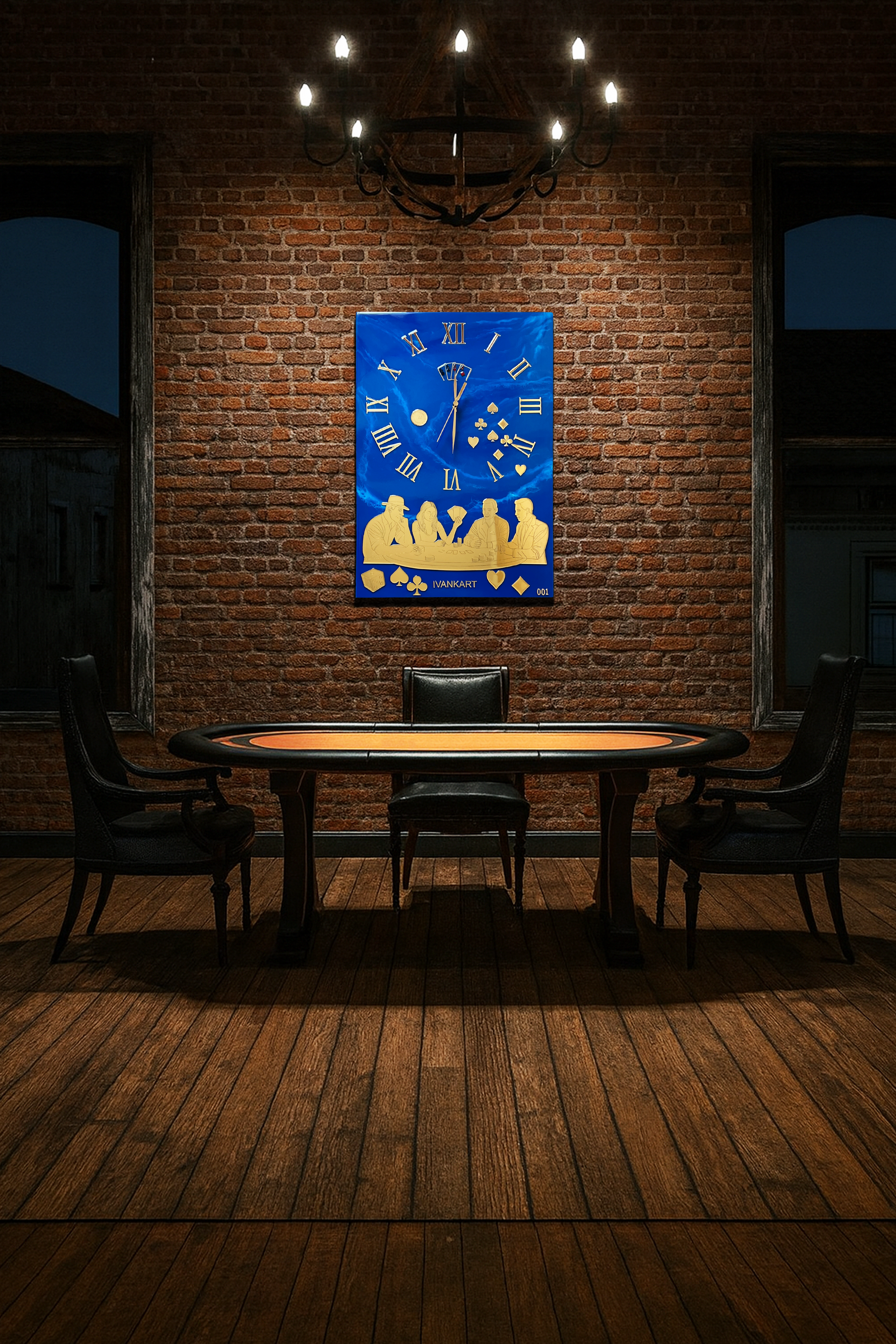 The royal-blue epoxy surface with raised gold numerals and card icons reads easily from across the room and pairs well with dark woods, leather, and neutral walls.