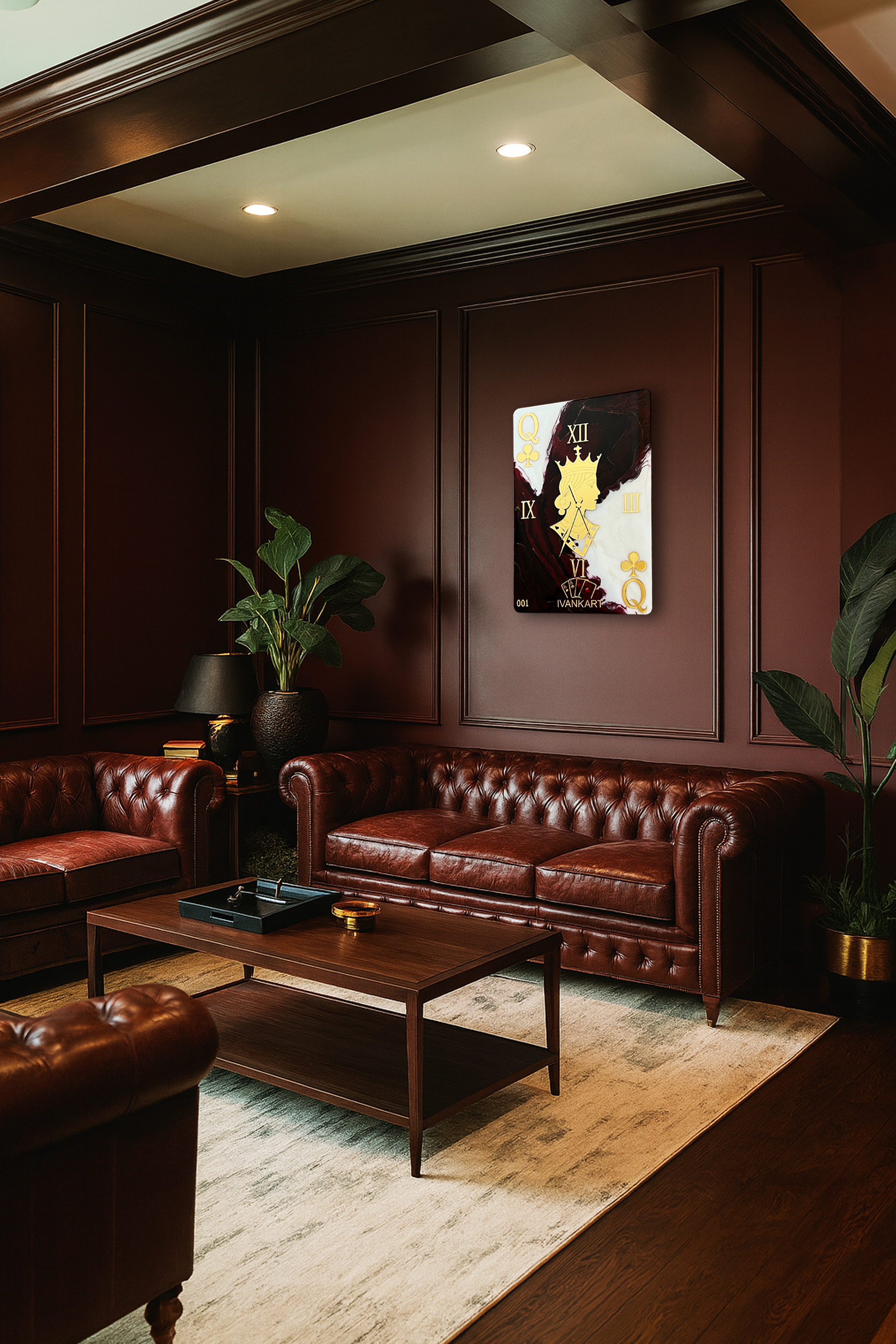 - Color: Burgundy & Ivory Marble with gold numerals, queen motif and club symbols
