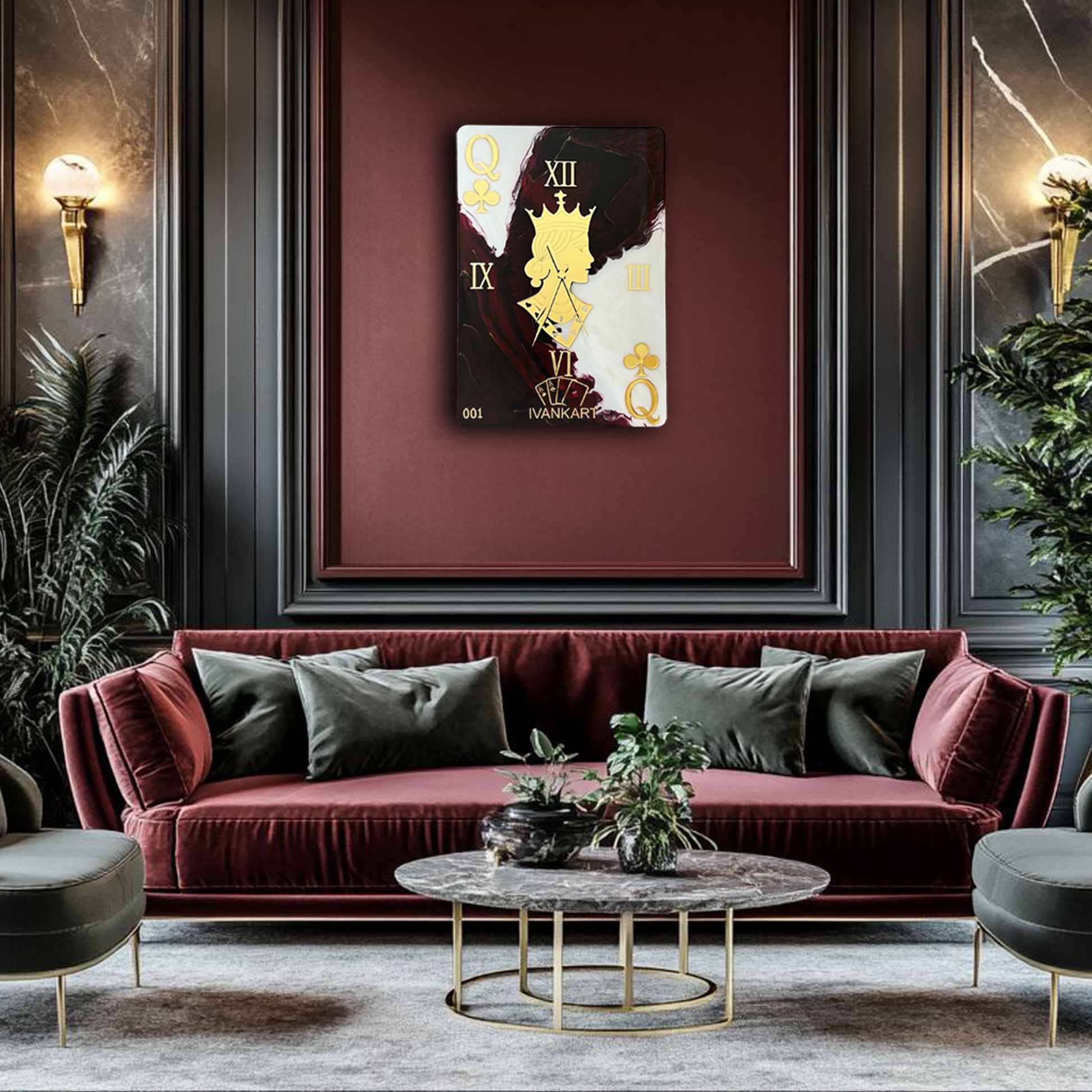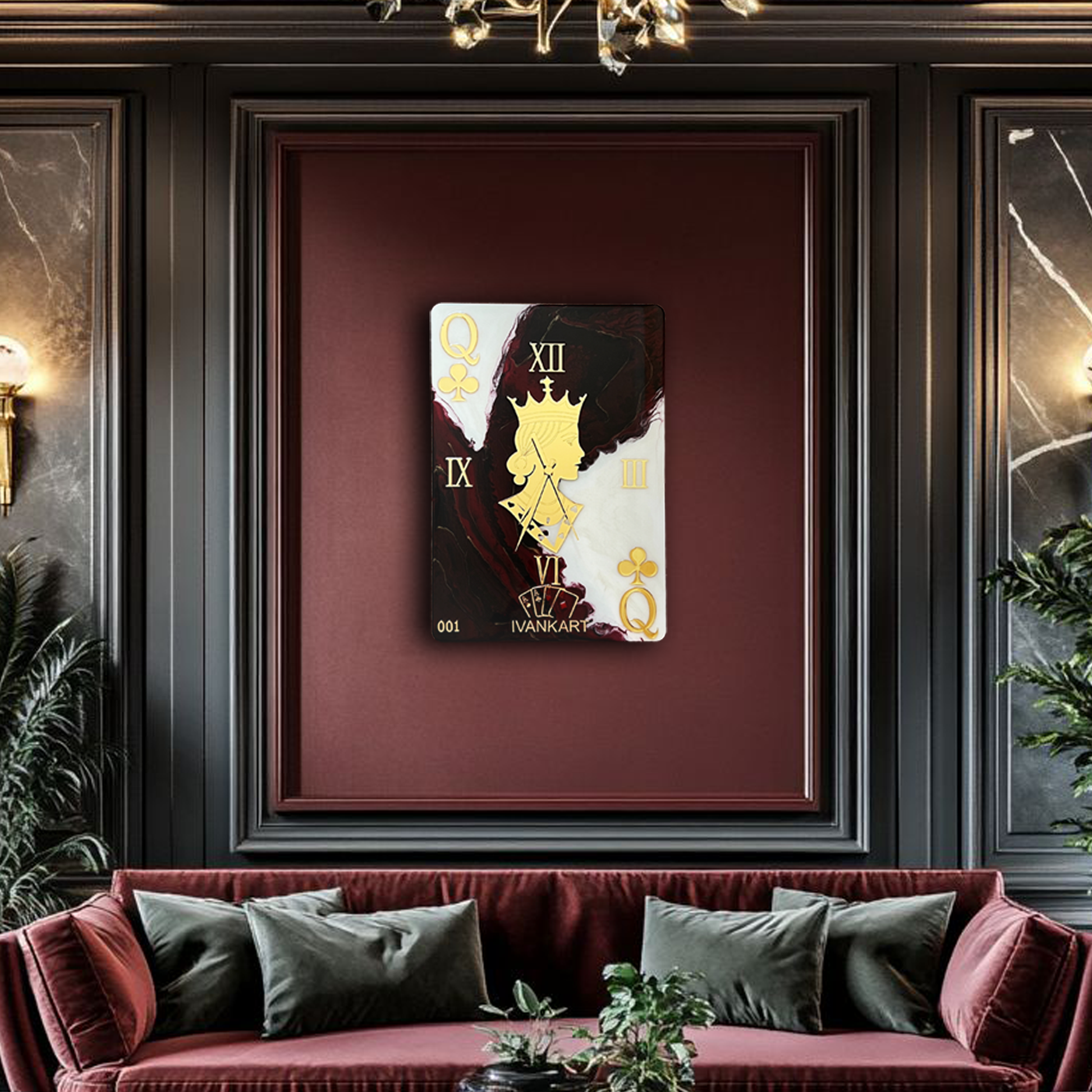 Queen of Clubs (60×40 cm) pairs a burgundy–ivory marbled surface with gold relief details: queen profile, Roman numerals and club icons, all sealed under a glossy epoxy coat. Rounded corners add a softer, refined outline.