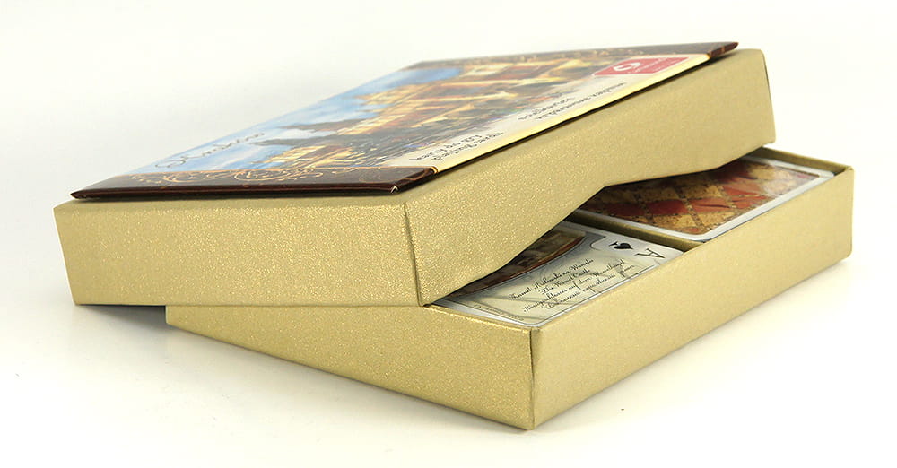 The package contains two decks of cards with watercolor images of Krakow's architectural monuments.